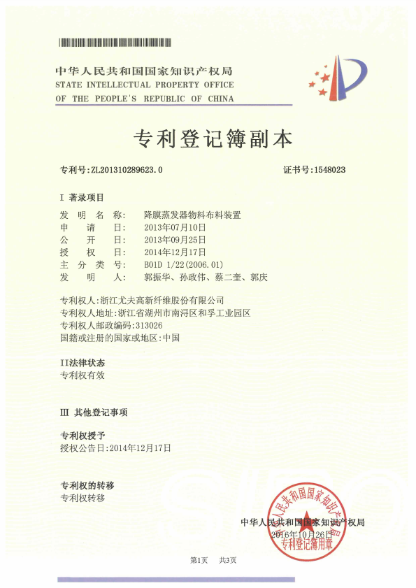 • 降膜蒸發器物料布料裝置 受讓專利登記簿
